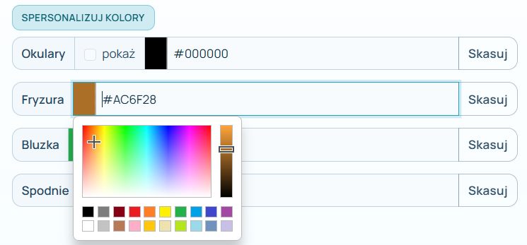 Po wyborze postaci spersonalizuj jej kolory, możesz też dodać okulary: