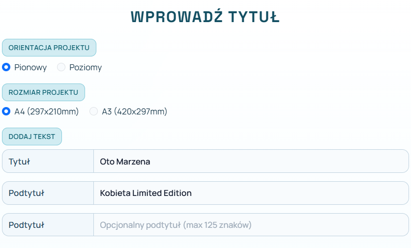 Określ rozmiar produktu oraz wpisz tytuł i podtytuł projektu:
