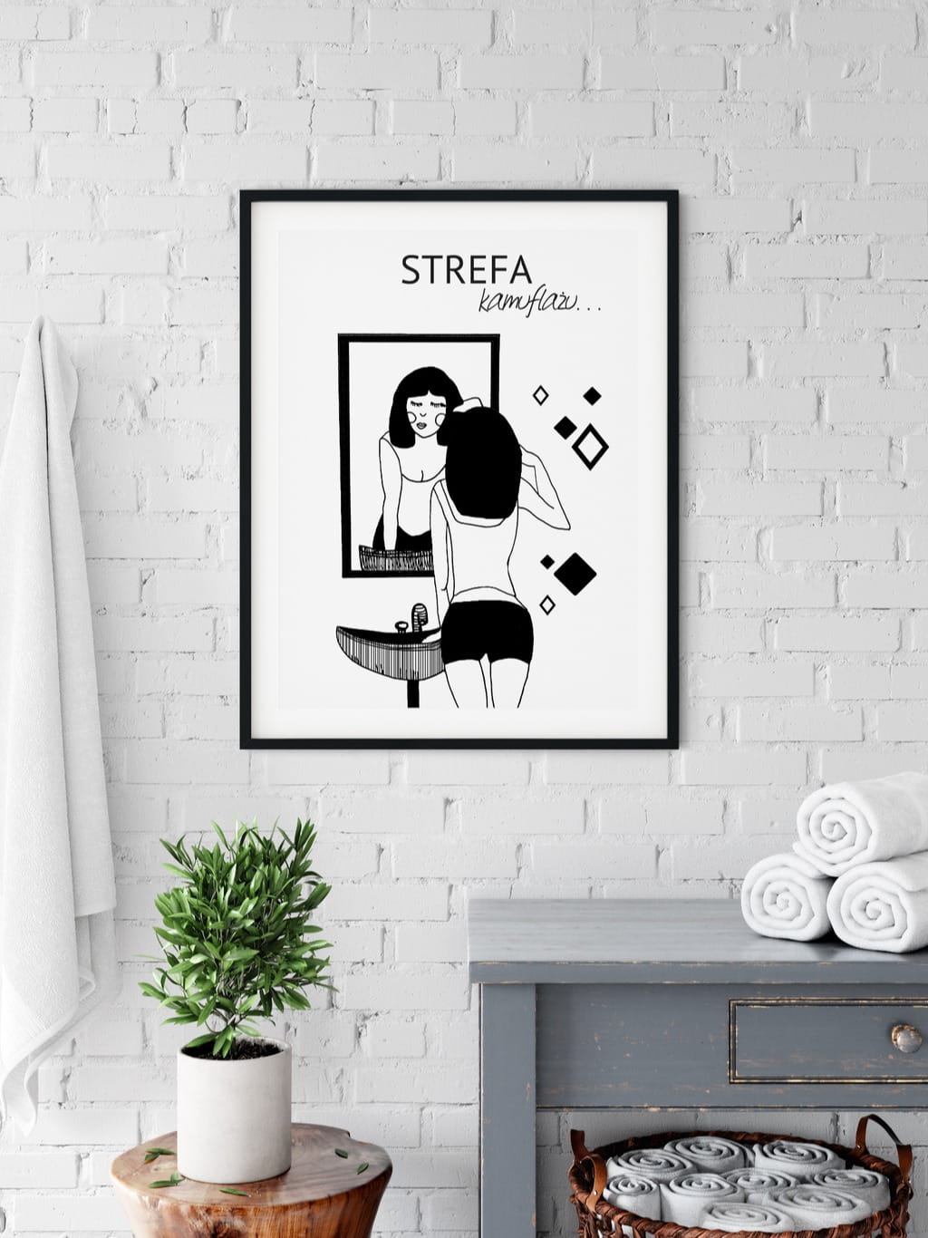 Plakat sprawdzi się jako wyjątkowy dodatek do łazienki i niepowtarzalna dekoracja wnętrza, a dzięki możliwości personalizacji możesz dostosować projekt do swoich potrzeb lub stworzyć oryginalny pomysł na prezent dla bliskich lub siebie. Dla wszystkich osób, które lubią designerskie wnętrza i patrzą na świat oraz siebie z dystansem.