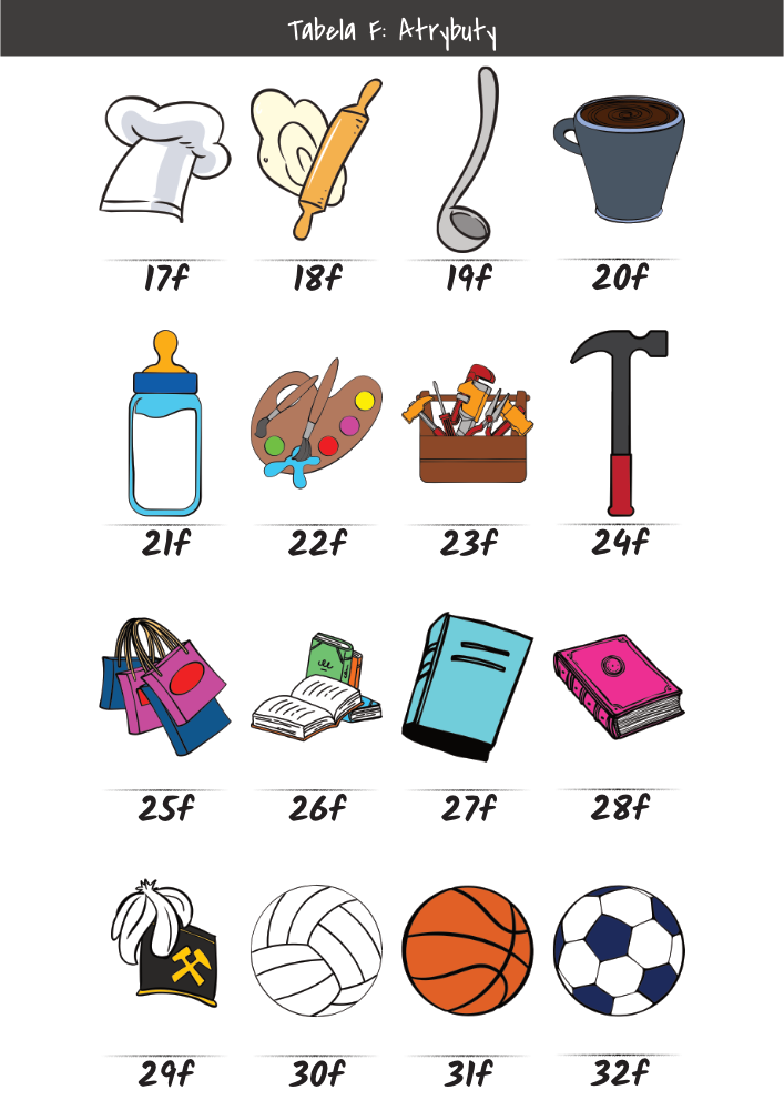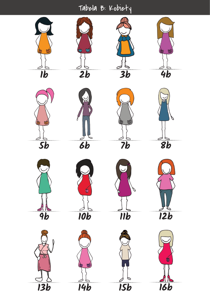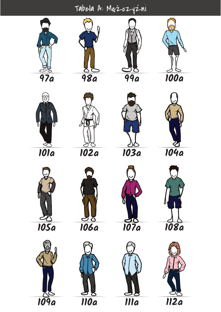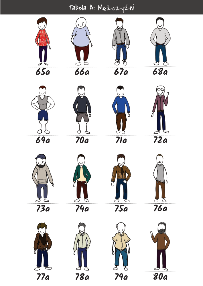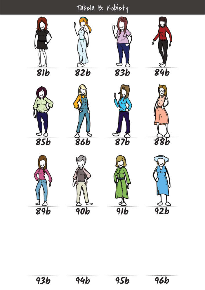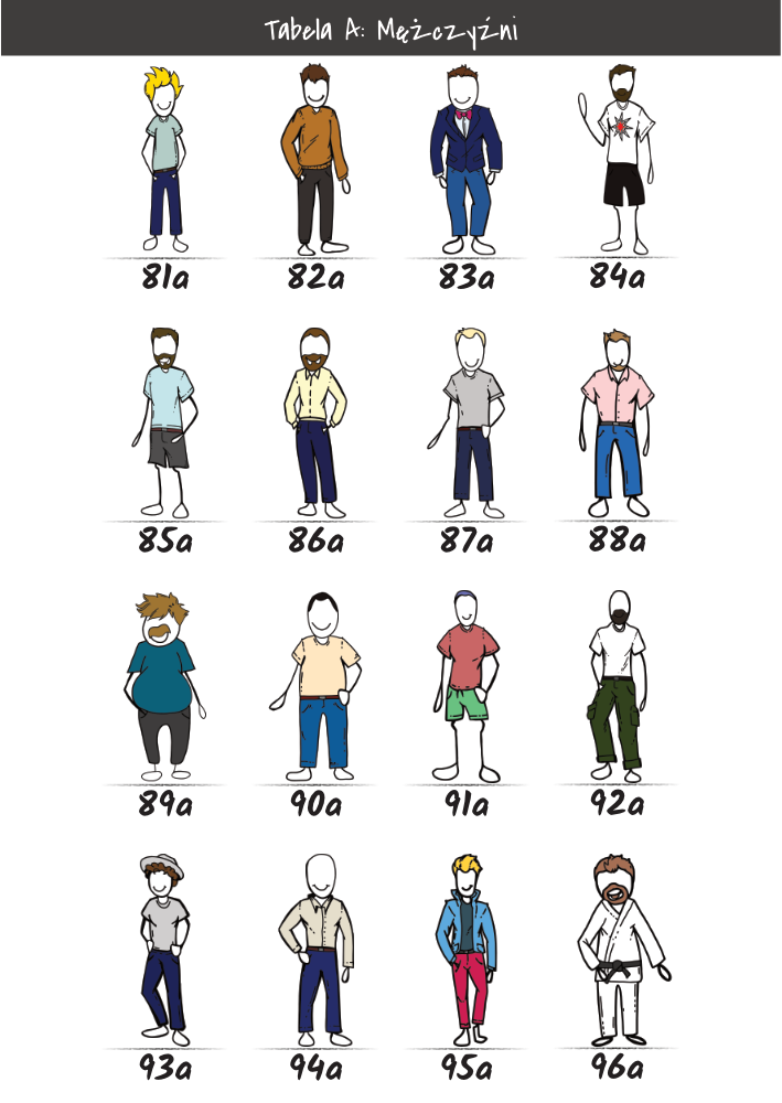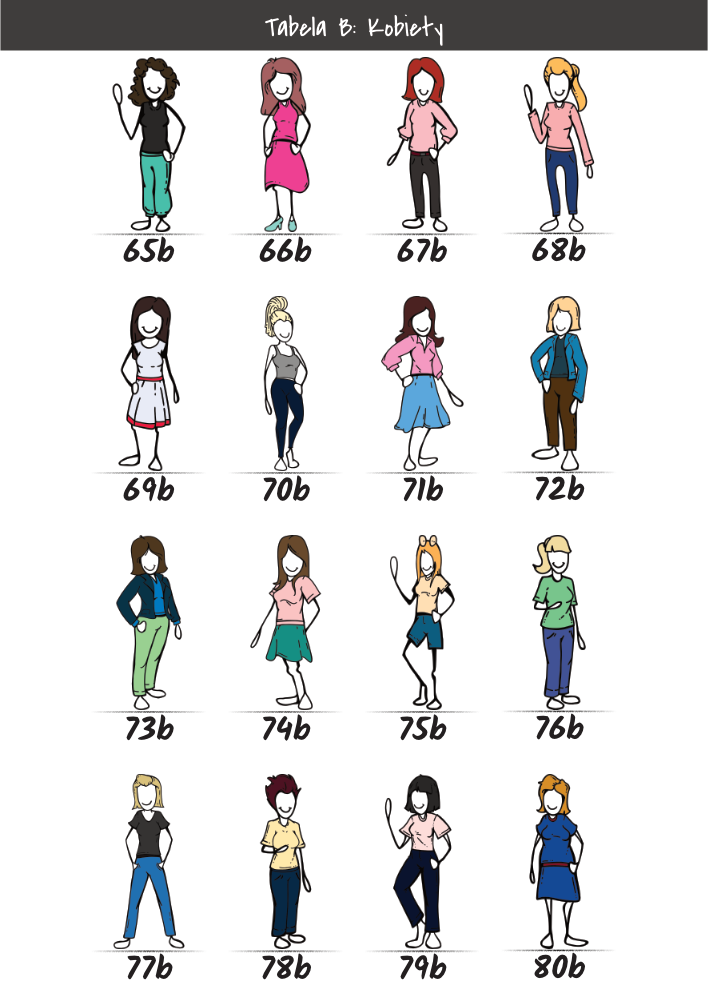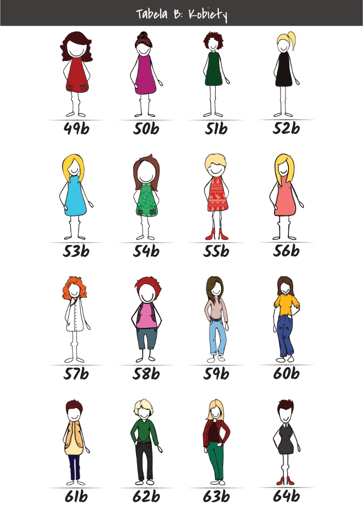 | MĘŻCZYŹNI | KOBIETY | DZIECI | PUPILE | ATRYBUTY | KOLORY |