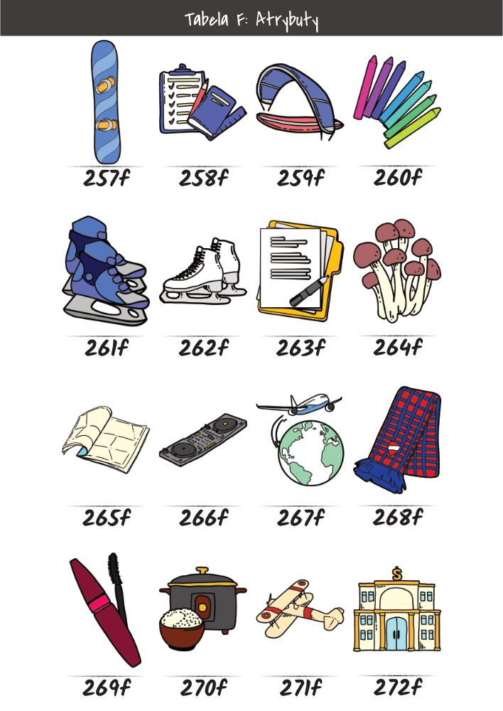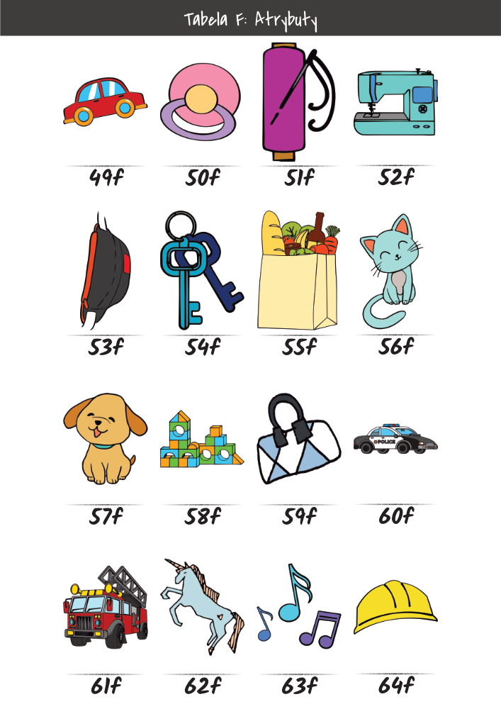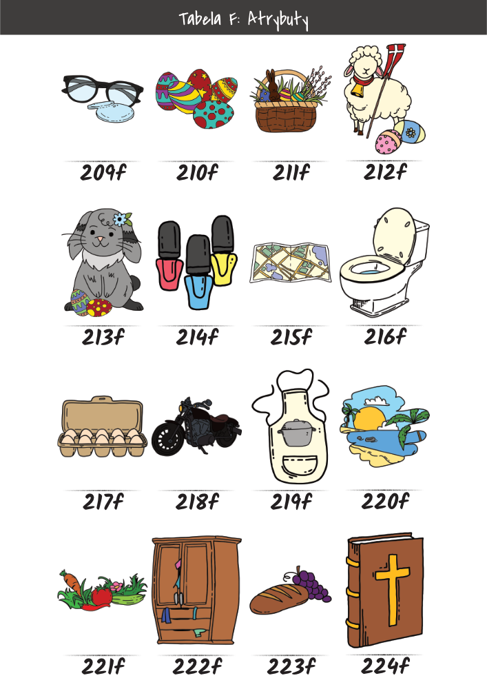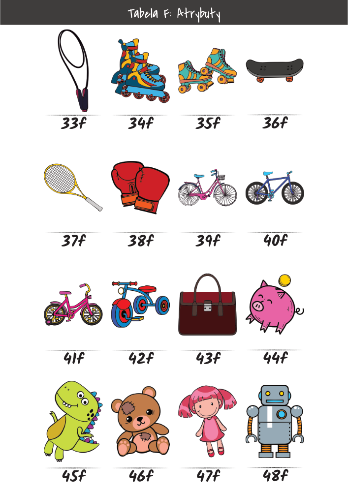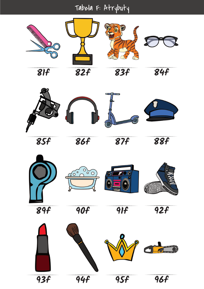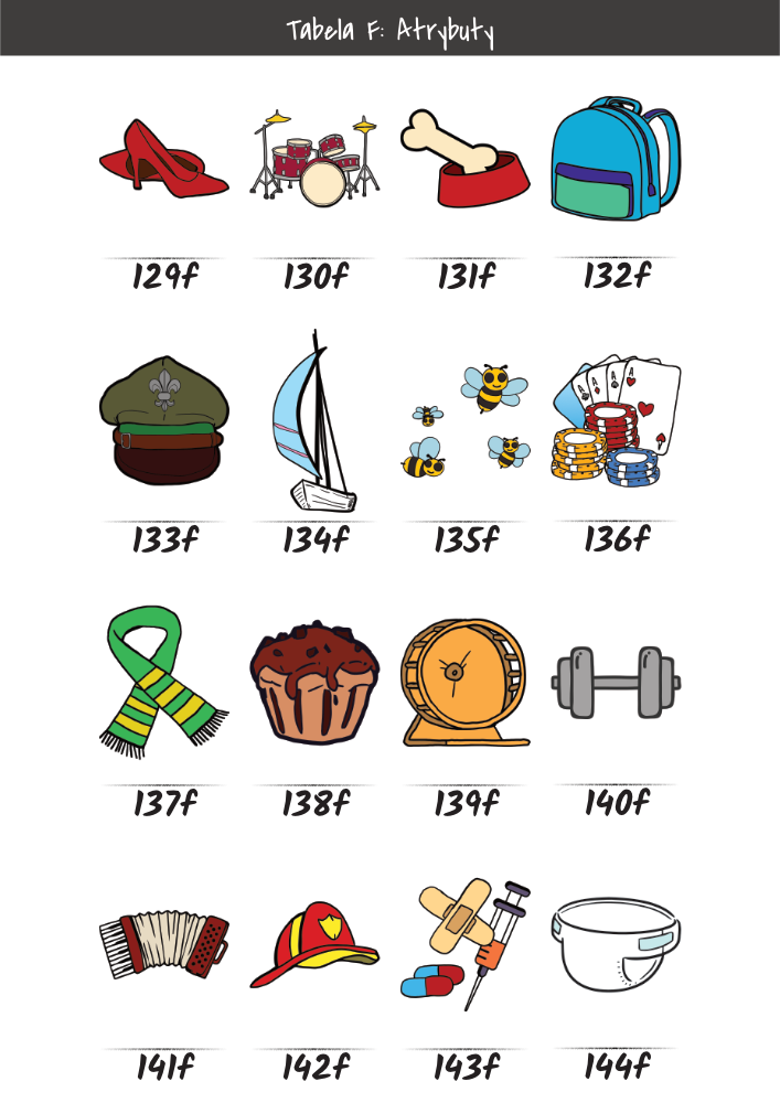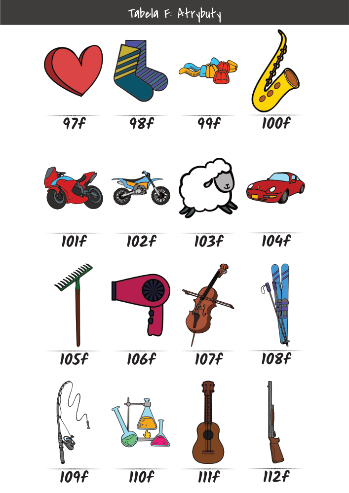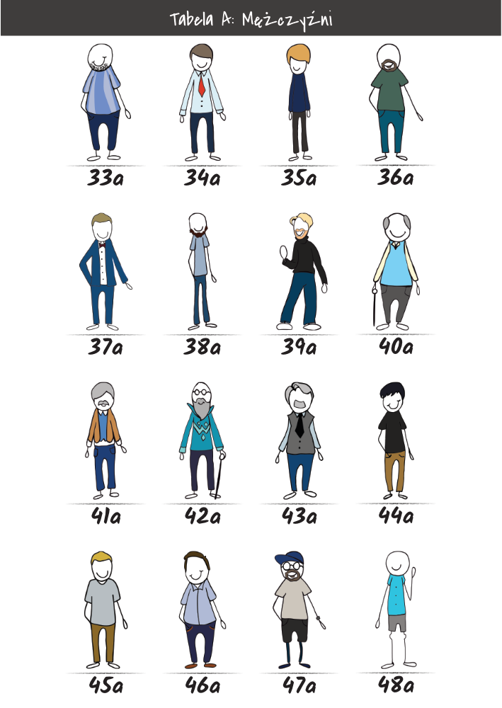 | MĘŻCZYŹNI | KOBIETY | DZIECI | PUPILE | ATRYBUTY | KOLORY |